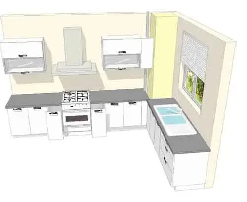 常见的厨房为矩形,橱柜一般为L型,靠窗部位一般放水槽,较长的墙面悬挂油烟机。